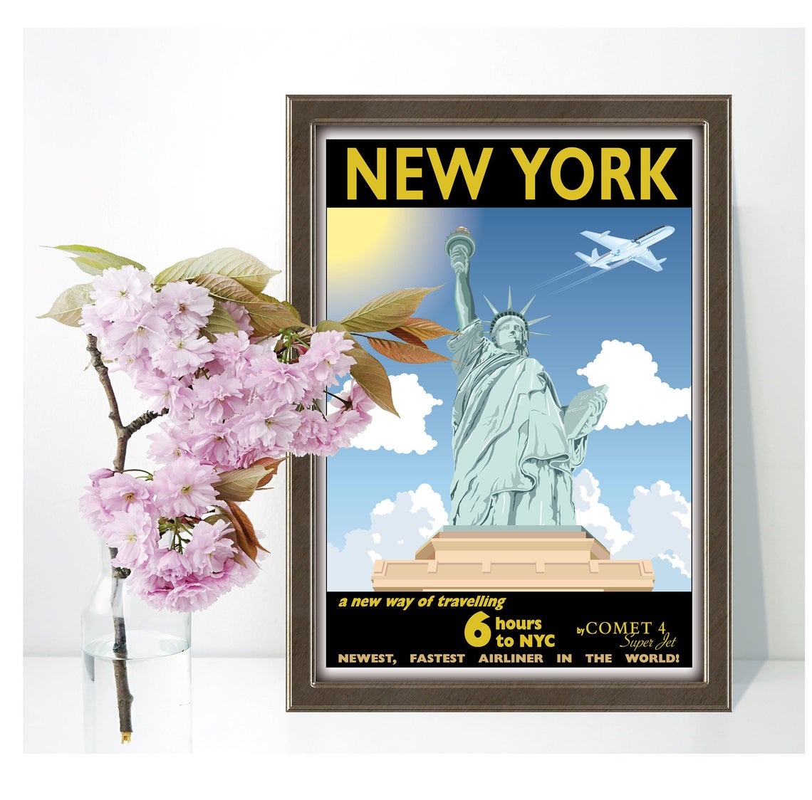 Statue of Liberty, New York, Comet 4, NYC, Airliner, Jet, Travel Poster, Print, Vintage, Souvenir, Gift, Poster, A4, A3, A2 in Retro style