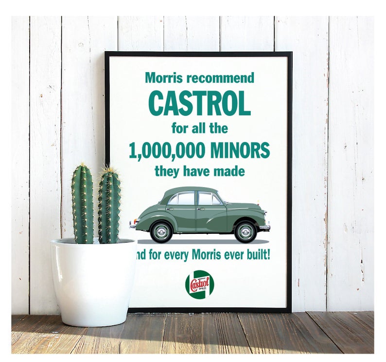 Vintage Style 1950's/1960's Morris Minor Castrol Motoring Advert Poster, Print, Souvenir, Gift, Poster, A4, A3, A2 in Retro style