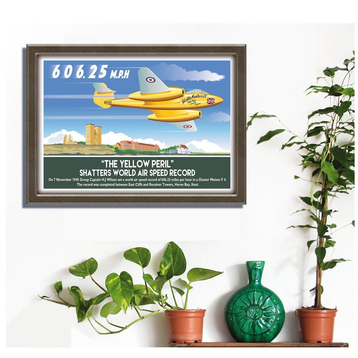 Vintage Style 1940's, Gloster Meteor, Yellow Peril, World Air Speed Record, Poster, Plane, Herne Bay Kent